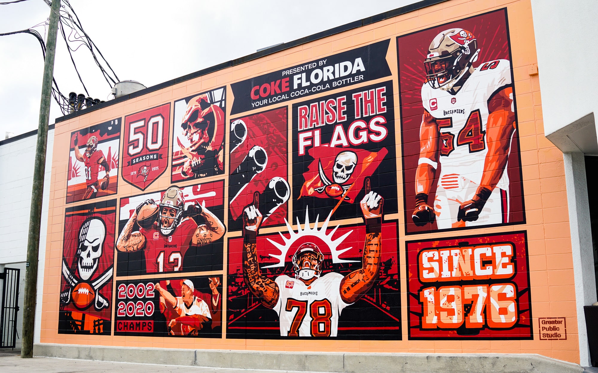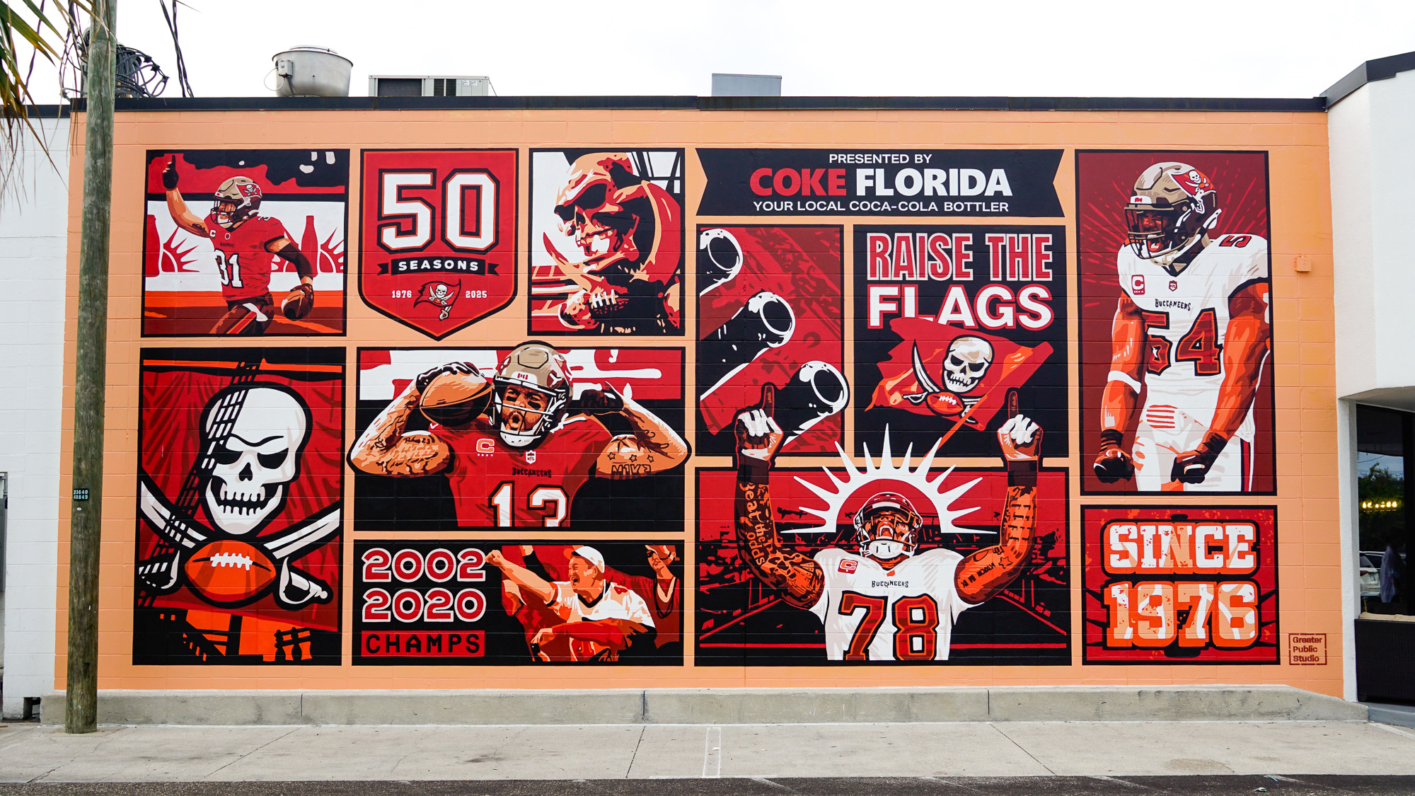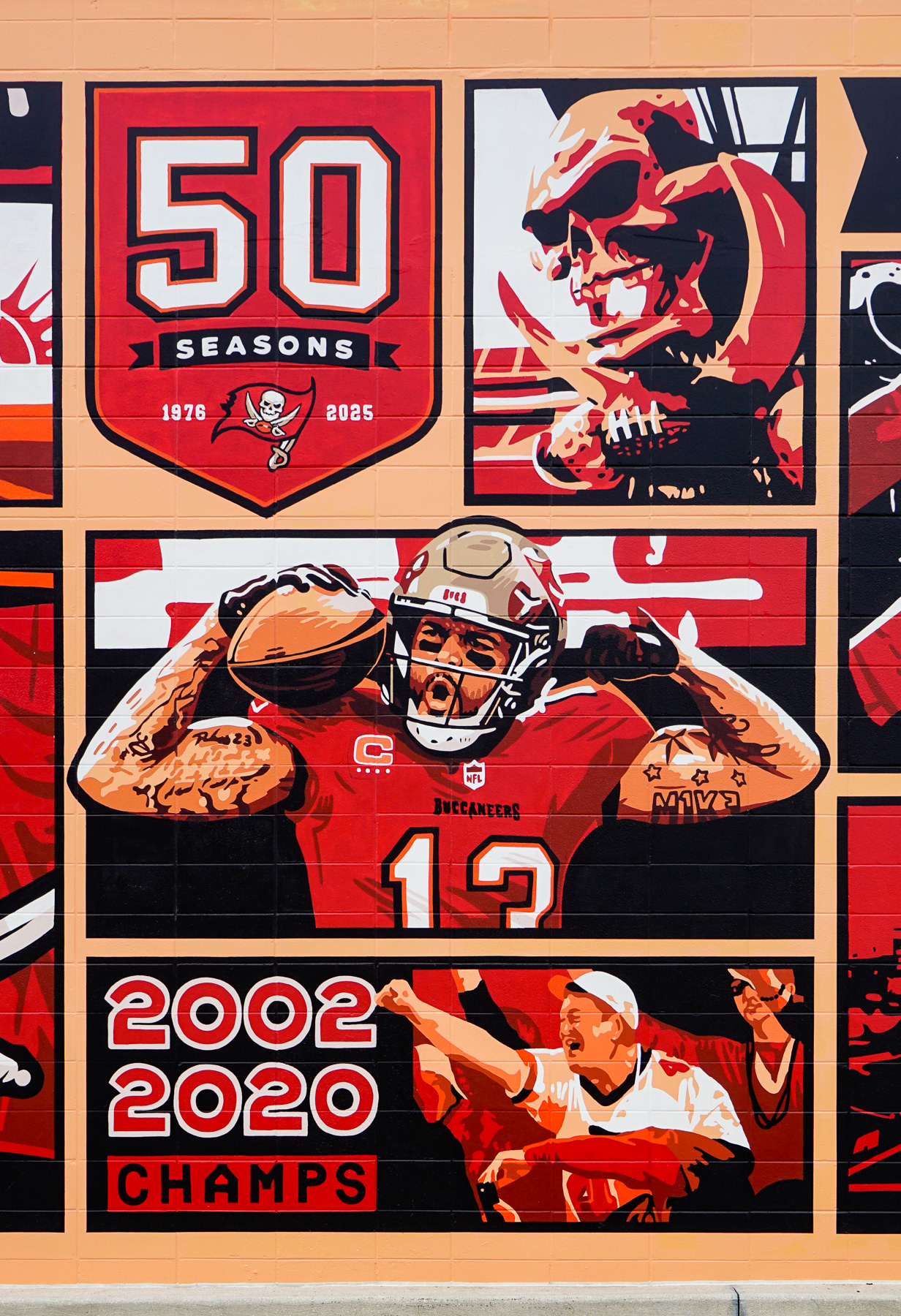A mural in South Tampa celebrating 50 impactful seasons of the Tampa Bay Buccaneers.