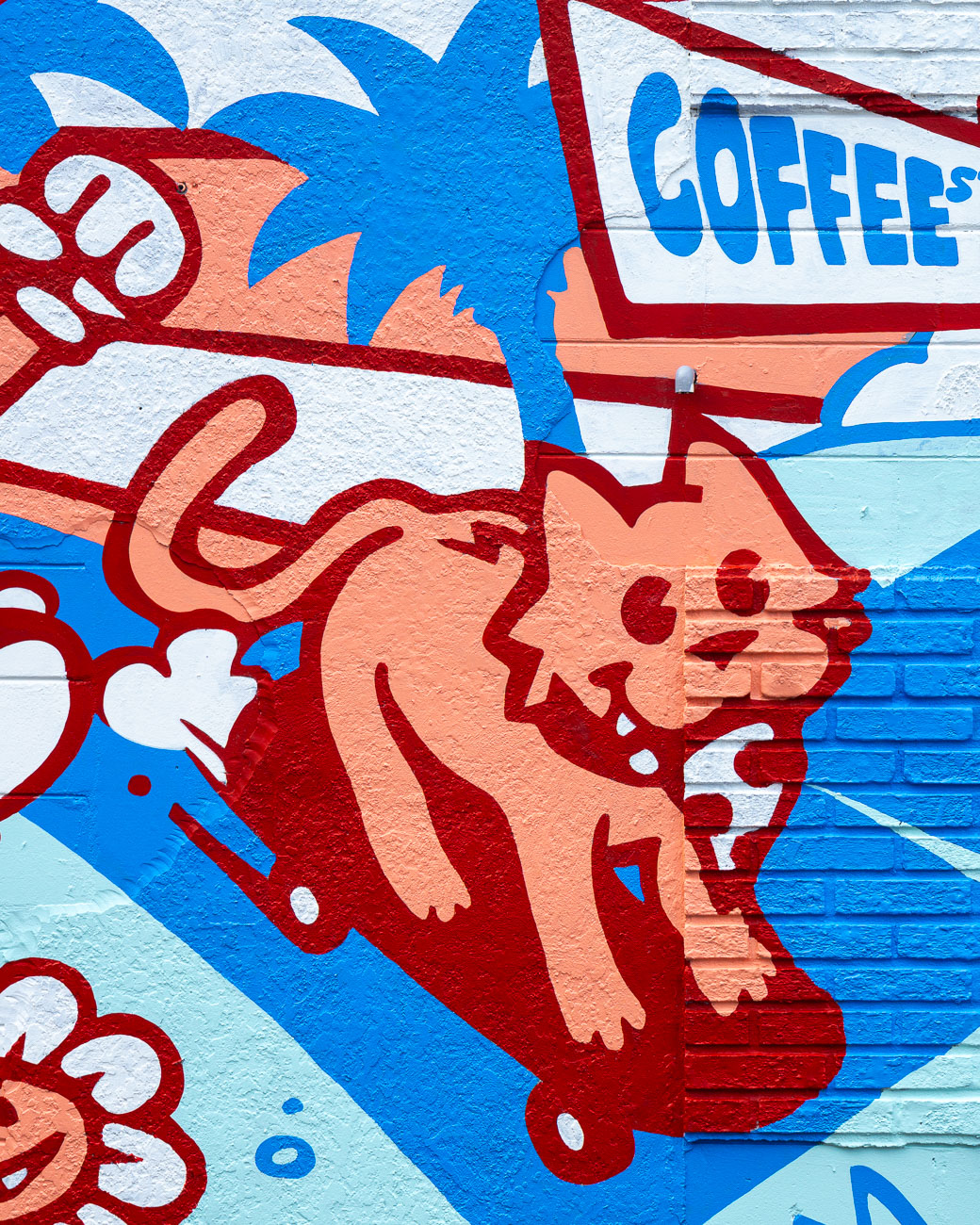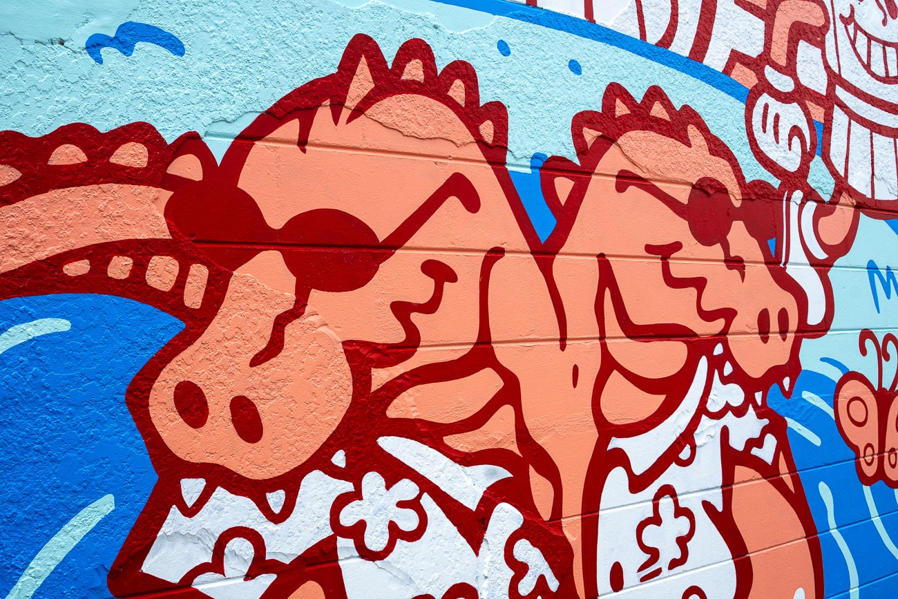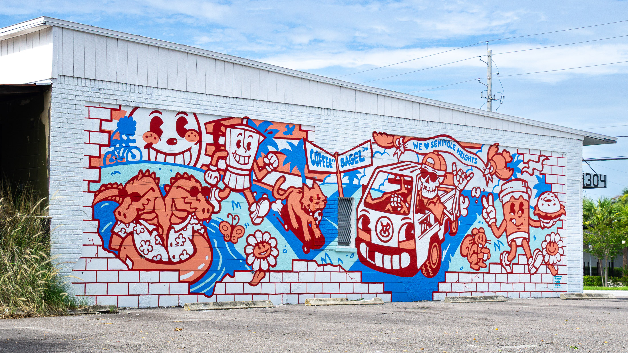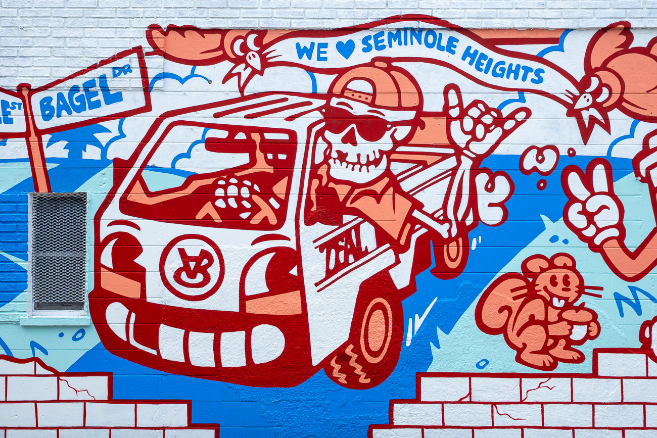 A mural at The Lab Coffee celebrating the diverse community of Seminole Heights with a cast of rubber-hose style cartoon characters.