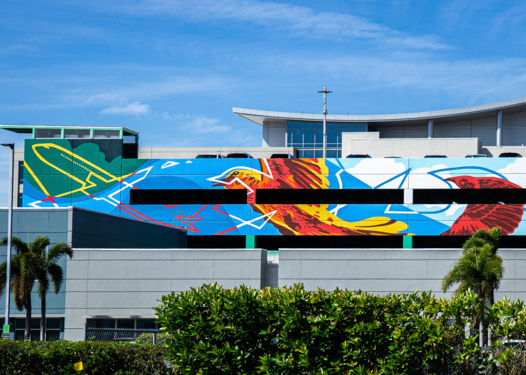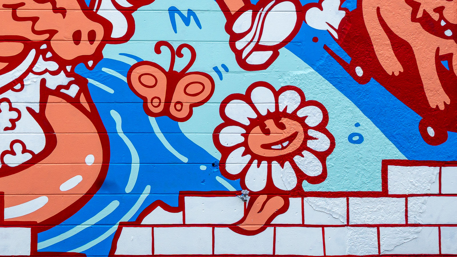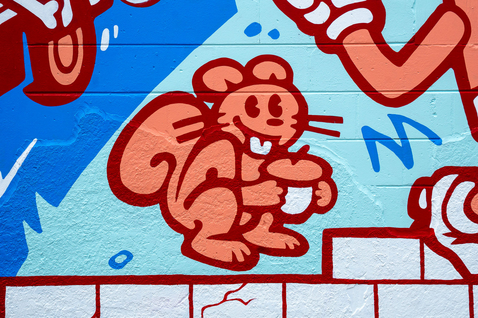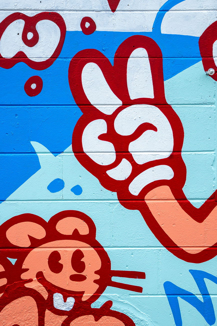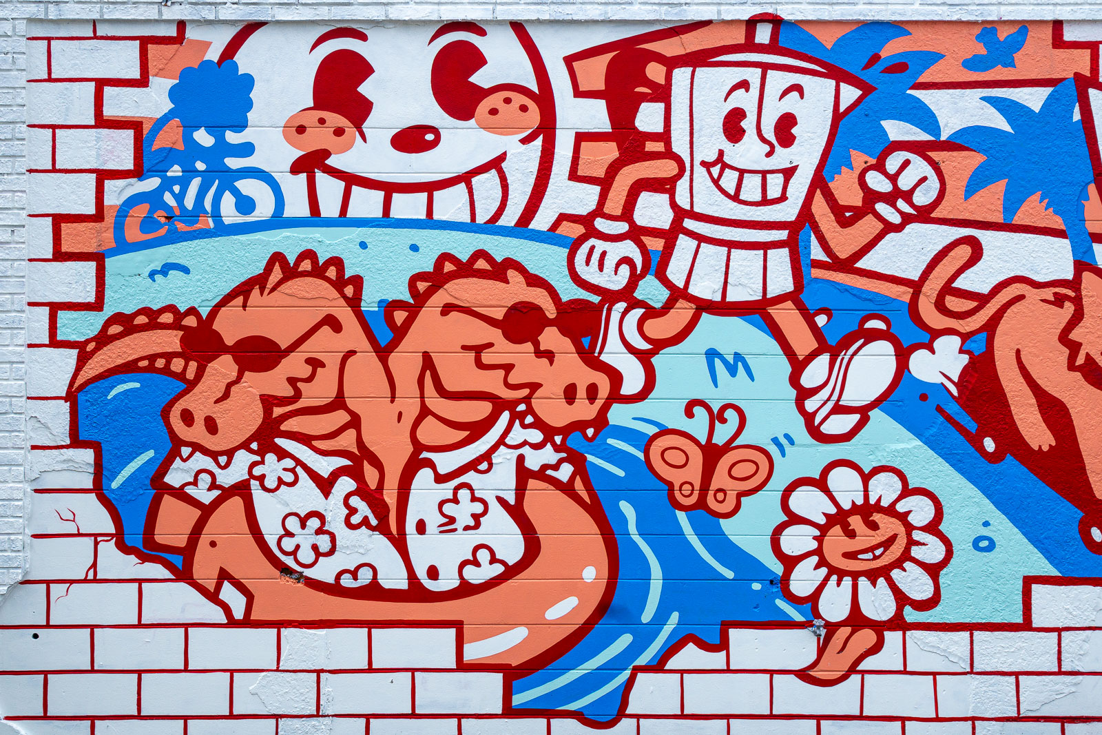 A mural at The Lab Coffee celebrating the diverse community of Seminole Heights with a cast of rubber-hose style cartoon characters.