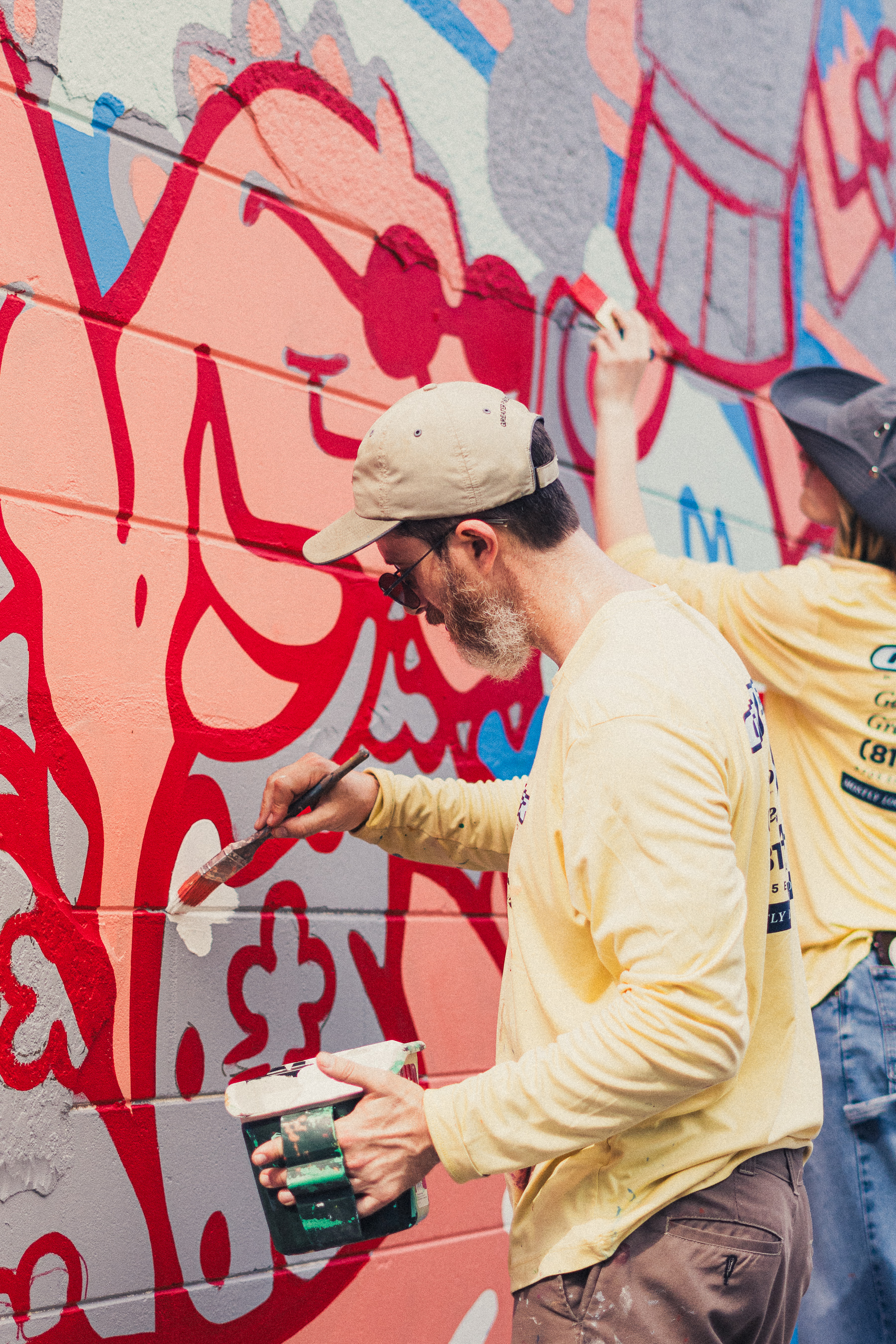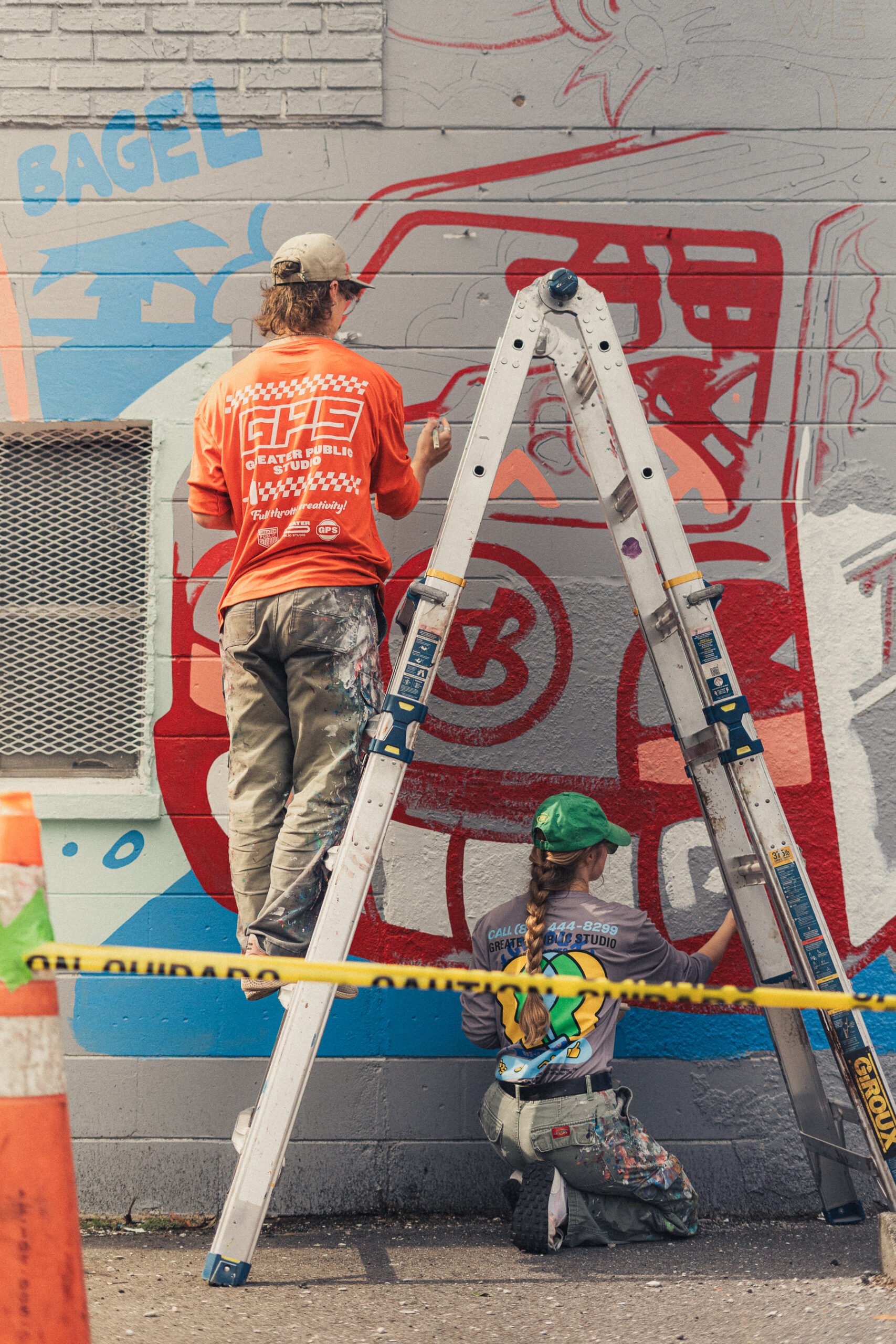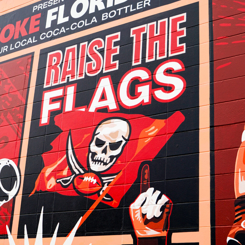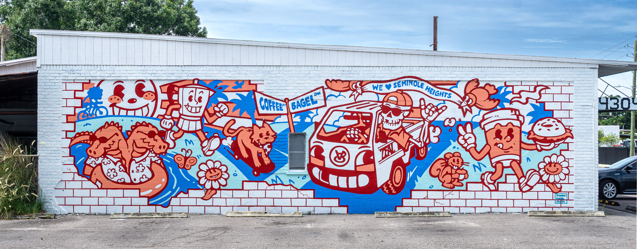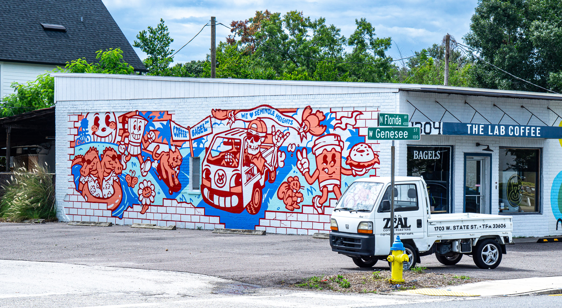 For the illustration, the development process was informed by bagel and coffee cup characters already in use by the Lab, which we used as a jumping off point to create a whole cast of other characters. Included in the hand painted mural are local references, such as the two-headed gator from a Seminole Heights legend, a cat from the local pizza shop, the delivery truck parked out front of the Lab, and the model skeleton that the Lab uses in their social content.
