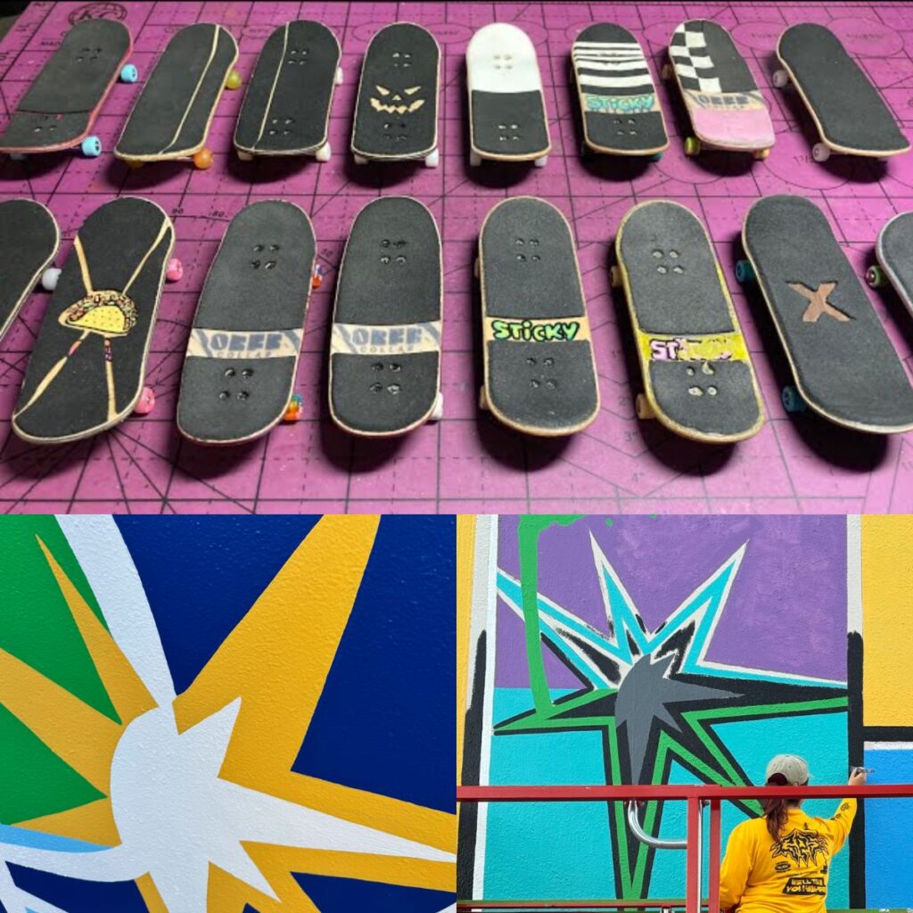 One of our internal levers for inspiration came via our head coach/designer Jay, who has been deeply immersed in skateboarding since he was 9 years old. Jay’s background as a skateboarder and sticker-head (collecting, slapping, trading brand decals, skate-brand icons) fed the mural’s visual DNA. When you live the sticker/decal/swapping culture, you perceive shapes, icons, patterns, torn posters, slaps and urban textures differently—and that informed our design path.