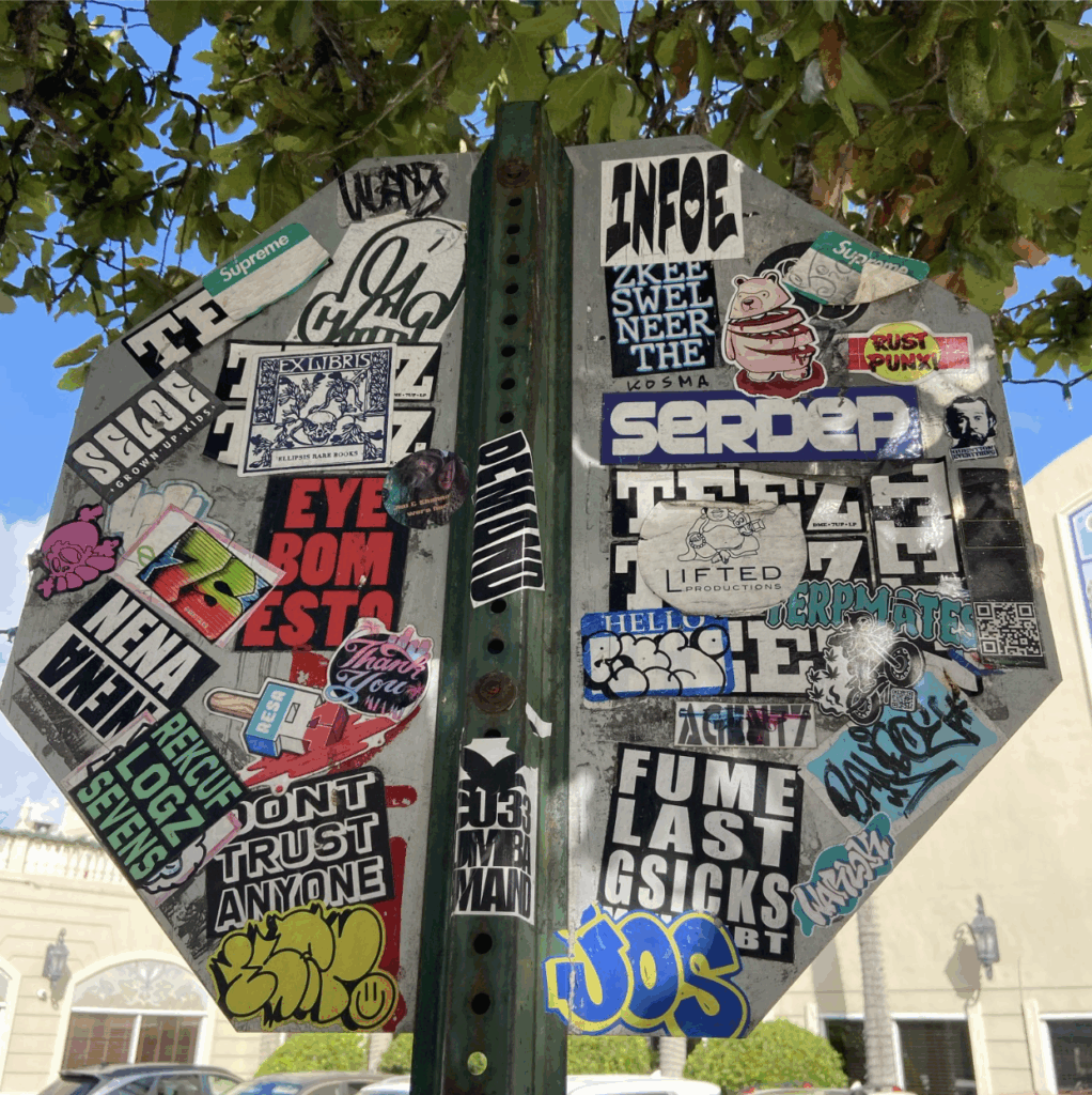 Sticker Slaps: Likewise, skateboarders and street artists have long used sticker slaps—small decals, logos, and tags—adhered to walls, poles, benches, and boards. These quick, repeatable marks create informal networks of identity and community, leaving behind traces of subculture wherever they land.